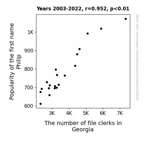 This means 90.6% of the change in the one variable (i.e., The number of file clerks in Georgia) is predictable based on the change in the other (i.e., Popularity of the first name Philip) over the 20 years from 2003 through 2022.