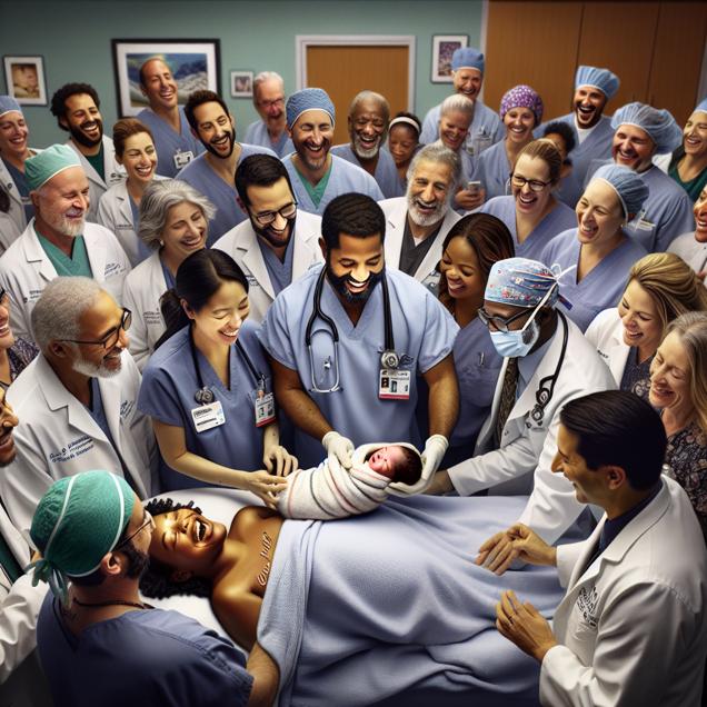 Prompt: Generate an image that portrays a hyper-realistic scene in a bustling Oregon hospital. A group of obstetricians and gynecologists gathers around a newborn baby named Aliya. The baby is wrapped in a blanket with her name embroidered on it, and the doctors are smiling and celebrating the new addition to the world. The emphasis should be on capturing the significance of Aliya's name and the dedication of the medical professionals, showcasing the warmth and joy of the moment. The depiction should include only scenes, people, and objects, it should not include text or speech bubbles.