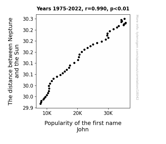 This means 97.9% of the change in the one variable (i.e., Popularity of the first name John) is predictable based on the change in the other (i.e., The distance between Neptune and the Sun) over the 48 years from 1975 through 2022.