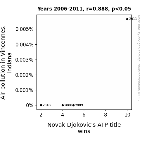 This means 78.8% of the change in the one variable (i.e., Novak Djokovic's ATP title wins) is predictable based on the change in the other (i.e., Air pollution in Vincennes, Indiana) over the 6 years from 2006 through 2011.