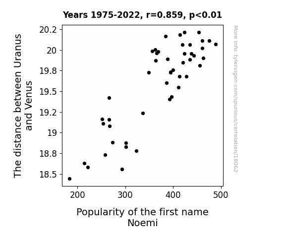 This means 73.8% of the change in the one variable (i.e., Popularity of the first name Noemi) is predictable based on the change in the other (i.e., The distance between Uranus and Venus) over the 48 years from 1975 through 2022.