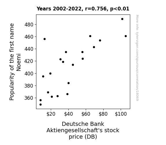 This means 57.1% of the change in the one variable (i.e., Deutsche Bank Aktiengesellschaft's stock price (DB)) is predictable based on the change in the other (i.e., Popularity of the first name Noemi) over the 21 years from 2002 through 2022.