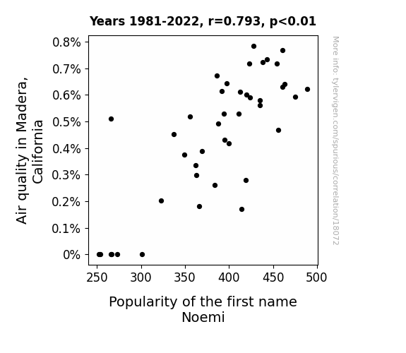 This means 62.9% of the change in the one variable (i.e., Popularity of the first name Noemi) is predictable based on the change in the other (i.e., Air quality in Madera, California) over the 42 years from 1981 through 2022.