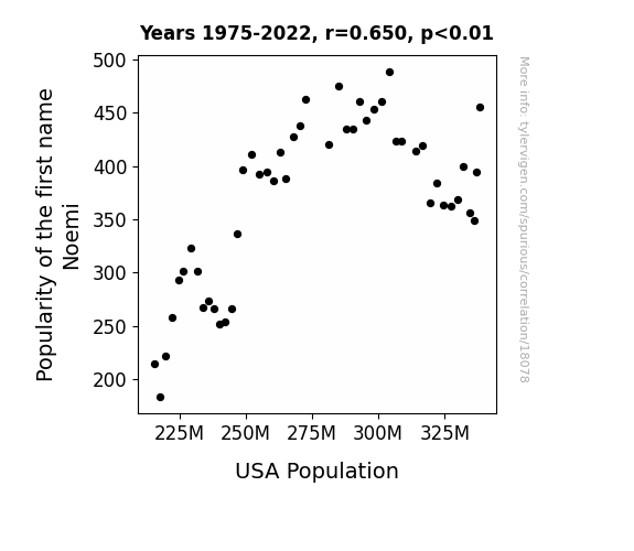 This means 42.3% of the change in the one variable (i.e., USA Population) is predictable based on the change in the other (i.e., Popularity of the first name Noemi) over the 48 years from 1975 through 2022.
