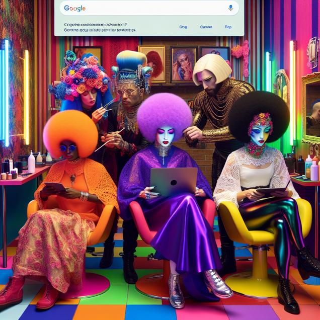 Prompt: Generate an image of a cyber folk-inspired scene set in a vibrant hair salon in Minnesota. Within the salon, three eccentric costume attendants are meticulously styling wigs and applying theatrical makeup for a performance. Meanwhile, in the corner of the salon, a computer screen displays a search bar with "male pattern baldness" typed into Google, showing search results related to the query. The scene should exude a sense of creative energy and technological integration, blending the traditional art of hairstyling and makeup with modern digital elements. The depiction should include only scenes, people, and objects, it should not include text or speech bubbles.