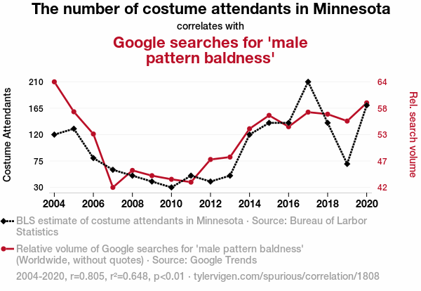 This means 64.8% of the change in the one variable (i.e., Google searches for 'male pattern baldness') is predictable based on the change in the other (i.e., The number of costume attendants in Minnesota) over the 17 years from 2004 through 2020.