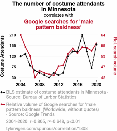 Fig. 1 displays a scatterplot illustrating the robust correlation between the number of costume attendants in Minnesota and Google searches for 'male pattern baldness'. The plot showcases a clear, linear relationship, with the number of costume attendants increasing as the volume of Google searches for 'male pattern baldness' rises, and vice versa.