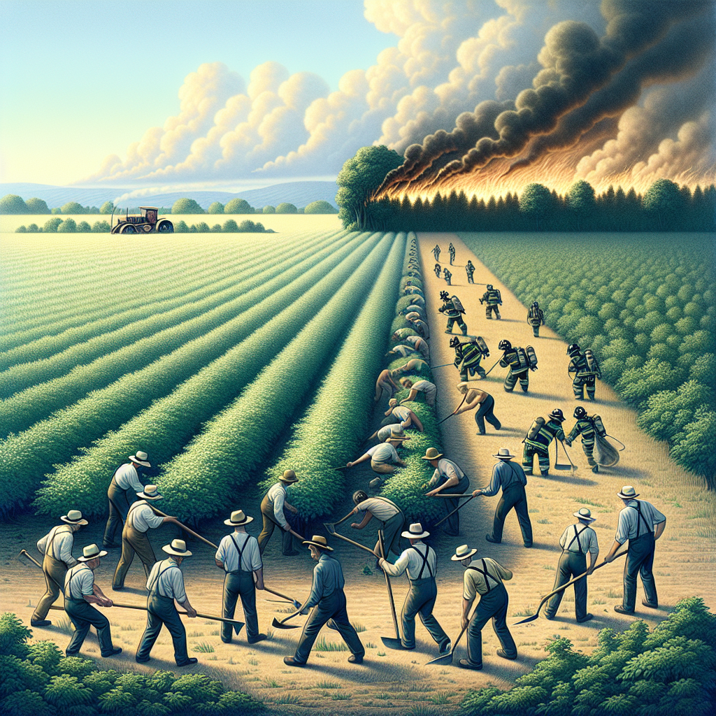 Prompt: Generating Prompt: [ Concept art ] In a serene Indiana countryside, a tranquil field fills the foreground as a group of people meticulously prune a row of lush bushes. In the distance, a small cluster of firefighters races towards a distant forest fire, their urgent movements hinting at the potential danger. The contrast between the calm field and the distant fire creates an intriguing juxtaposition of serenity and emergency. The depiction should include only scenes, people, and objects, it should not include text or speech bubbles.