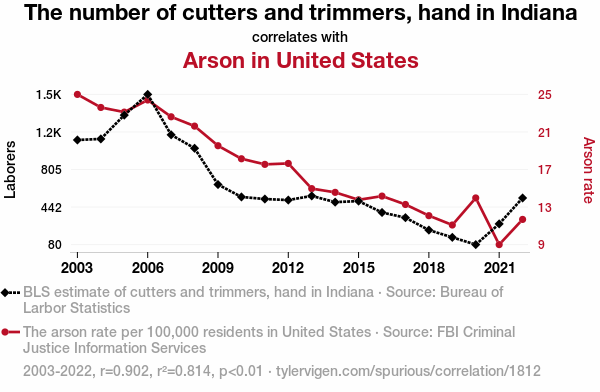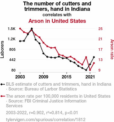 User prompt: Please provide potential search keywords for a paper titled The Cutters and Trimmers' Hand in Arson: A Statistical Analysis with an abstract of Our research delves into the peculiar connection between the number of cutters and trimmers' hand injuries in Indiana and the incidence of arson across the United States. Leveraging data from the Bureau of Labor Statistics and FBI Criminal Justice Information Services, we conducted a comprehensive statistical analysis spanning from 2003 to 2022. Our findings reveal a surprisingly robust correlation coefficient of 0.9024278 and a statistically significant p-value of less than 0.01, highlighting a noteworthy relationship between these seemingly disparate phenomena. Our study sheds light on the unanticipated interplay between workplace hand injuries in the landscaping industry and the prevalence of deliberate fire-setting nationwide. We invite readers to join us on this unexpected journey through the intricate web of statistical correlations, where the seemingly mundane world of yard work converges with the incendiary realm of criminal behavior.