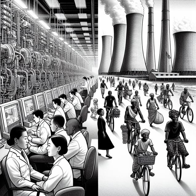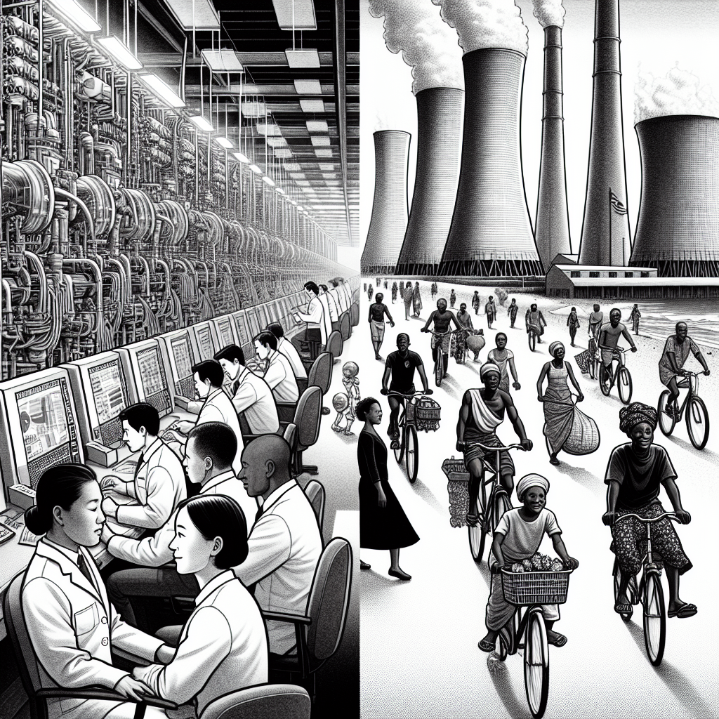 ChatGPT: Generate an image that combines a black-and-white newspaper illustration style with the following scene: In Tennessee, a small group of nuclear engineers is diligently working inside a futuristic power plant, tending to the complex machinery of nuclear reactors. Simultaneously, in Togo, a bustling street scene unfolds with people using bicycles, walking, and showing minimal fuel consumption while going about their daily activities. Capture the stark contrast between the advanced technology in one location and the sustainable, eco-friendly practices in the other.
