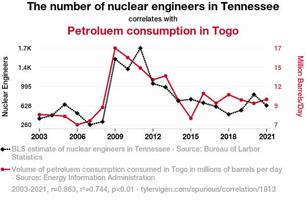 This means 74.4% of the change in the one variable (i.e., Petroluem consumption in Togo) is predictable based on the change in the other (i.e., The number of nuclear engineers in Tennessee) over the 19 years from 2003 through 2021.