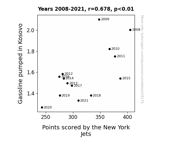 This means 46% of the change in the one variable (i.e., Points scored by the New York Jets) is predictable based on the change in the other (i.e., Gasoline pumped in Kosovo) over the 14 years from 2008 through 2021.