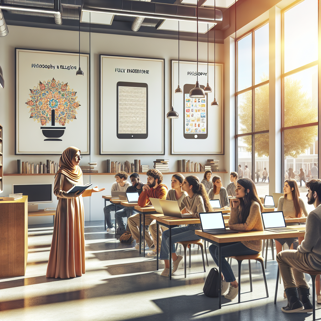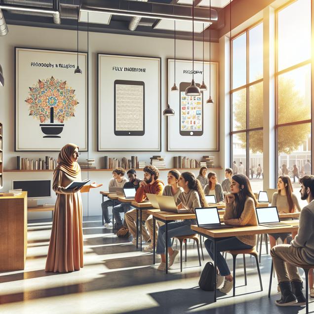 Prompt: Sure, here's an image generation prompt for DALL-E 3: "A serene Utah university classroom with large windows letting in a flood of natural light. The walls are adorned with minimalist Apple product posters, and in the center, a dynamic philosophy and religion teacher passionately engages a group of attentive students in a lively philosophical discussion. The teacher, with an Apple logo on their laptop, sparks thought-provoking insights and discussions. Outside, an Apple store exudes tranquility, with contented customers engaging in meaningful conversations with staff about the deeper significance behind their technological choices, while peacefully carrying Macbooks and iPhones." The depiction should include only scenes, people, and objects, it should not include text or speech bubbles.