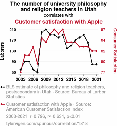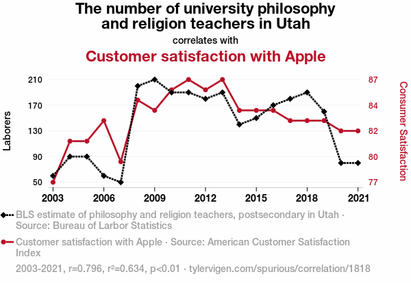 This means 63.4% of the change in the one variable (i.e., Customer satisfaction with Apple) is predictable based on the change in the other (i.e., The number of university philosophy and religion teachers in Utah) over the 19 years from 2003 through 2021.