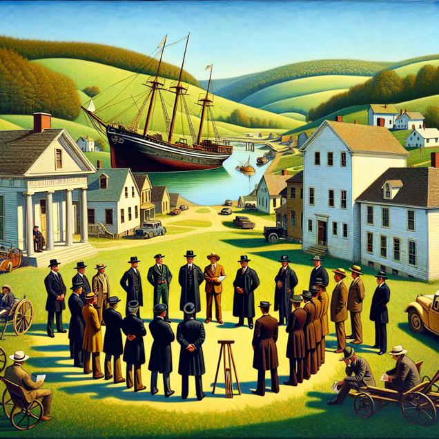 User prompt: Please respond with an image generation prompt that would be likely to create an interesting visual using DALLE-3, using the following style: [ Surrealism ] and depicting this scene: In a quaint West Virginia town, a group of bailiffs gather in front of the courthouse, discussing their duties for the day. In the distance, a large shipwreck can be seen on a nearby river, its masts jutting out of the water. The juxtaposition of the bailiffs representing the number of bailiffs in West Virginia and the shipwreck representing the number of shipwrecks creates a unique contrast between law enforcement and maritime accidents in the peaceful setting of the town. Keep the visual depiction simple. Do not include any words or speech bubbles.
