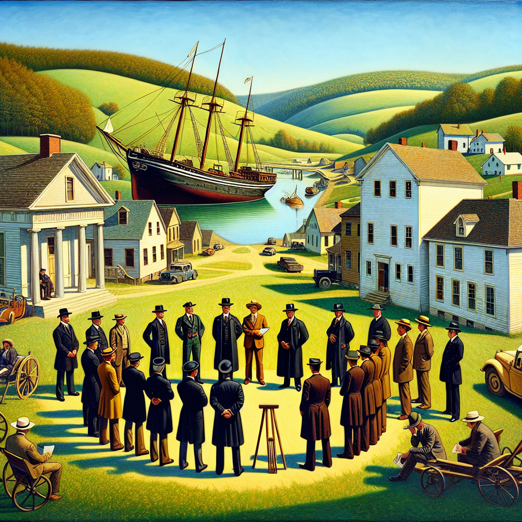 Prompt: Generate an image of a quaint West Virginia town, where a group of bailiffs congregate in front of the courthouse. They are engaged in discussion about their daily duties. In the distance, a large shipwreck is visible on a nearby river, with its masts rising from the water. The image should juxtapose the law enforcement represented by the bailiffs with the maritime accident symbolized by the shipwreck, creating a unique and surreal contrast. The surroundings should reflect the peaceful setting of the town. The depiction should include only scenes, people, and objects, it should not include text or speech bubbles.