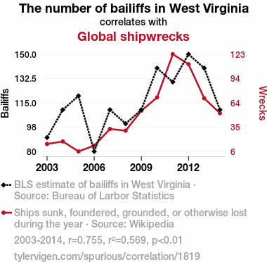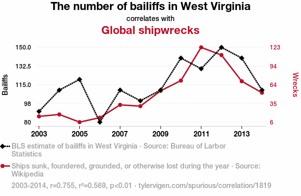 "bailiffs West Virginia correlation shipwrecks", "relationship between bailiffs shipwrecks", "statistics bailiffs shipwrecks", "unrelated phenomena connections", "whimsical data correlations", "curious statistical relationships", "exploring interconnected data points"