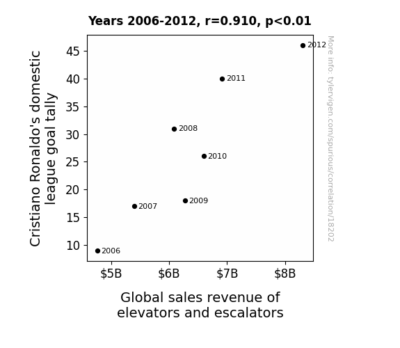 This means 82.9% of the change in the one variable (i.e., Global sales revenue of elevators and escalators) is predictable based on the change in the other (i.e., Cristiano Ronaldo's domestic league goal tally) over the 7 years from 2006 through 2012.