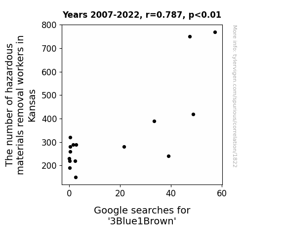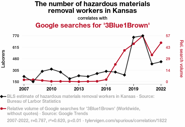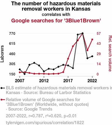- The spurious research paper: Removing Hazards and Searching for Math: A Correlation Between Hazardous Materials Removal Workers in Kansas and Google Searches for '3Blue1Brown'