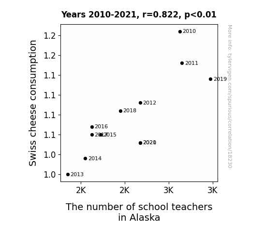 This means 67.6% of the change in the one variable (i.e., The number of school teachers in Alaska) is predictable based on the change in the other (i.e., Swiss cheese consumption) over the 12 years from 2010 through 2021.