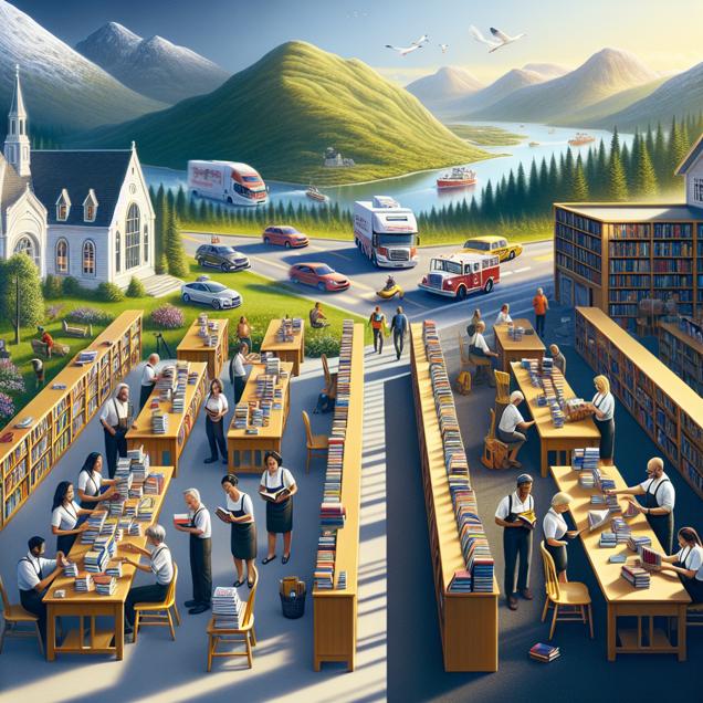 Prompt: [A photo-realistic image] Create an image of a cozy library in North Dakota, with warm lighting and shelves filled with books. Show a team of diligent library assistants sorting books and helping patrons. Also depict a scene across the ocean in Norway, where a fleet of cars and trucks travels through the scenic countryside, fueled by petroleum. The image should capture the contrast between the tranquil library and the bustling activity of the vehicles in the Norwegian landscape. Let the lighting in the library be inviting, and the vehicles in Norway should be depicted against a picturesque natural backdrop. The depiction should include only scenes, people, and objects, it should not include text or speech bubbles.
