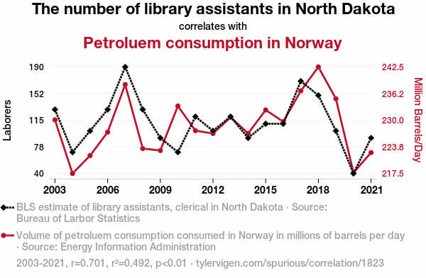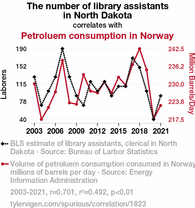 North Dakota, library assistants, petroleum consumption, Norway, correlation coefficient, Bureau of Labor Statistics, Energy Information Administration, statistical analysis, geographical linkage, cultural linkage, interplay, unrelated factors