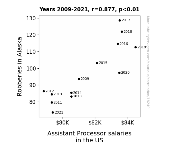 This means 77% of the change in the one variable (i.e., Assistant Processor salaries in the US) is predictable based on the change in the other (i.e., Robberies in Alaska) over the 13 years from 2009 through 2021.