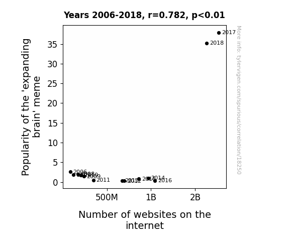 This means 61.1% of the change in the one variable (i.e., Number of websites on the internet) is predictable based on the change in the other (i.e., Popularity of the 'expanding brain' meme) over the 13 years from 2006 through 2018.