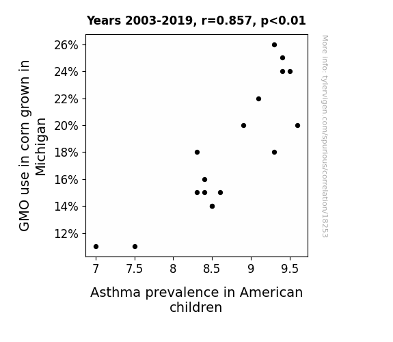 This means 73.4% of the change in the one variable (i.e., Asthma prevalence in American children) is predictable based on the change in the other (i.e., GMO use in corn grown in Michigan) over the 17 years from 2003 through 2019.