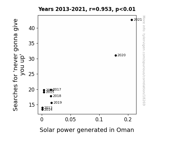 This means 90.8% of the change in the one variable (i.e., Solar power generated in Oman) is predictable based on the change in the other (i.e., Searches for 'never gonna give you up') over the 9 years from 2013 through 2021.