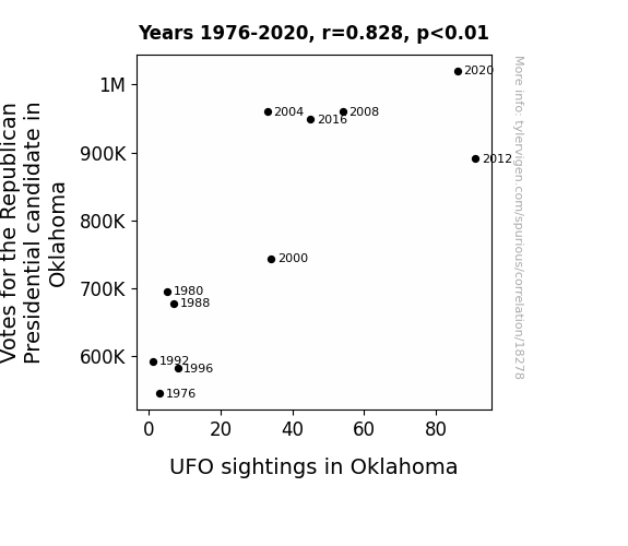 This means 68.6% of the change in the one variable (i.e., UFO sightings in Oklahoma) is predictable based on the change in the other (i.e., Votes for the Republican Presidential candidate in Oklahoma) over the 11 years from 1976 through 2020.