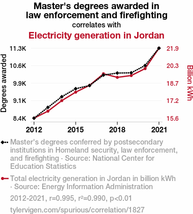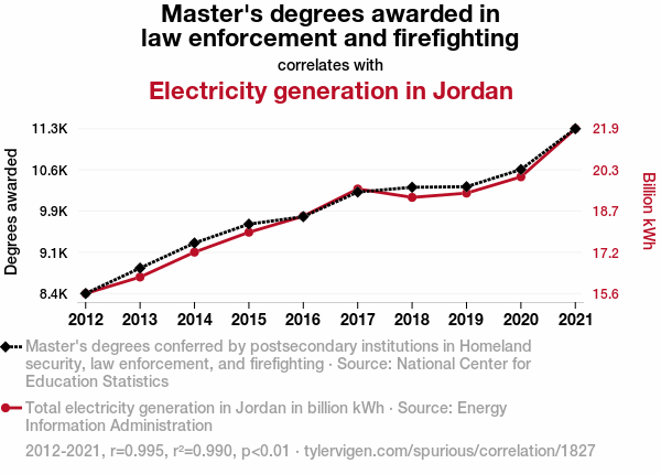 This means 99% of the change in the one variable (i.e., Electricity generation in Jordan) is predictable based on the change in the other (i.e., Master's degrees awarded in law enforcement and firefighting) over the 10 years from 2012 through 2021.