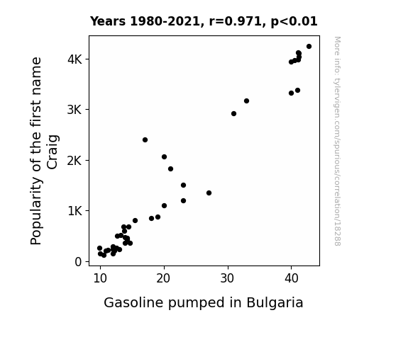 This means 94.2% of the change in the one variable (i.e., Gasoline pumped in Bulgaria) is predictable based on the change in the other (i.e., Popularity of the first name Craig) over the 42 years from 1980 through 2021.