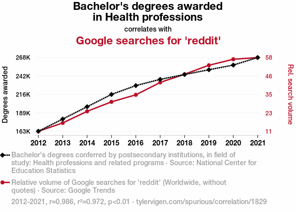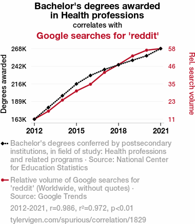 - The spurious research paper: A Healthy Degree of Interest: Uncovering the Relationship Between Health Professions Bachelor's Degrees and Reddit Searches
