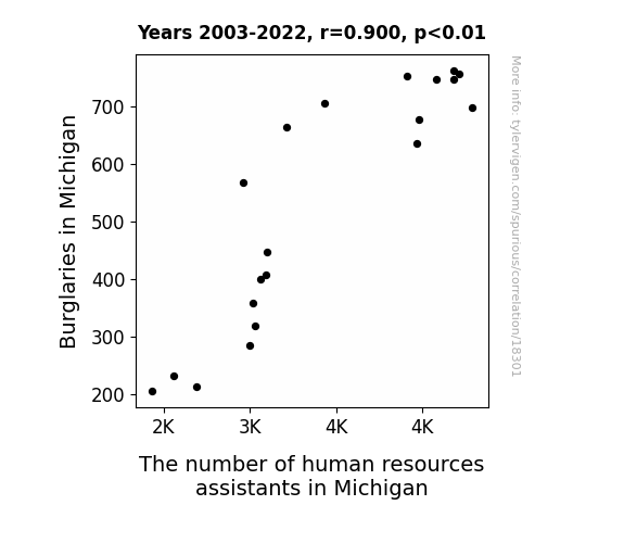 This means 81.1% of the change in the one variable (i.e., The number of human resources assistants in Michigan) is predictable based on the change in the other (i.e., Burglaries in Michigan) over the 20 years from 2003 through 2022.