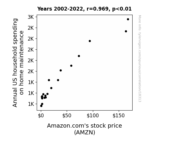 This means 94% of the change in the one variable (i.e., Amazon.com's stock price (AMZN)) is predictable based on the change in the other (i.e., Annual US household spending on home maintenance) over the 21 years from 2002 through 2022.