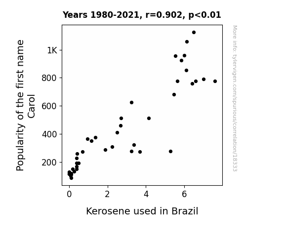 This means 81.4% of the change in the one variable (i.e., Kerosene used in Brazil) is predictable based on the change in the other (i.e., Popularity of the first name Carol) over the 42 years from 1980 through 2021.