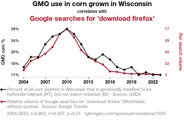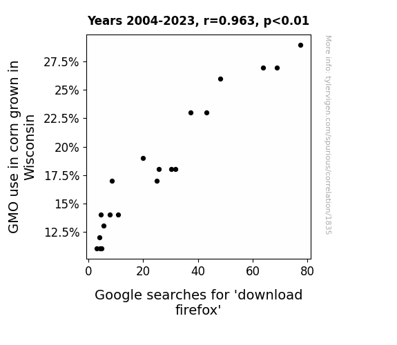 This means 92.7% of the change in the one variable (i.e., Google searches for 'download firefox') is predictable based on the change in the other (i.e., GMO use in corn grown in Wisconsin) over the 20 years from 2004 through 2023.