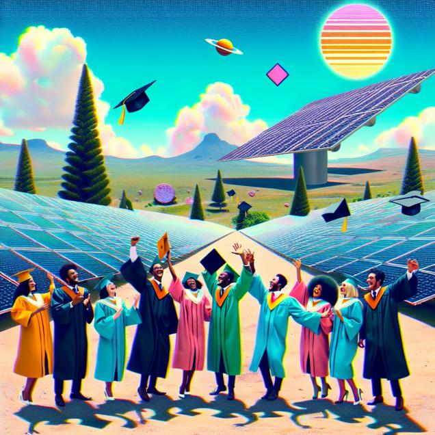 ChatGPT: Create an image of a surreal, vaporwave-inspired park scene in Madagascar. Show a group of graduates in colorful graduation gowns and caps, celebrating with their Bachelor's degrees in parks, recreation, leisure, fitness, and kinesiology. The atmosphere should exude a retro-futuristic vibe with vibrant pastel colors. In the background, depict sleek and modern solar panels absorbing the bright sunlight, juxtaposed against the natural beauty of the park. The composition should convey a sense of harmony between human achievement and sustainable, clean energy, infused with the dreamy aesthetics of vaporwave art.