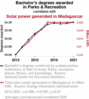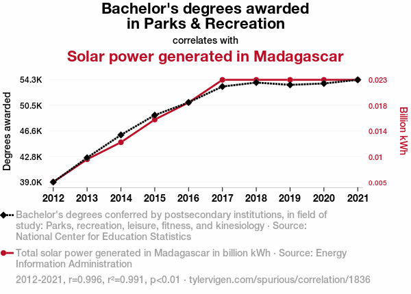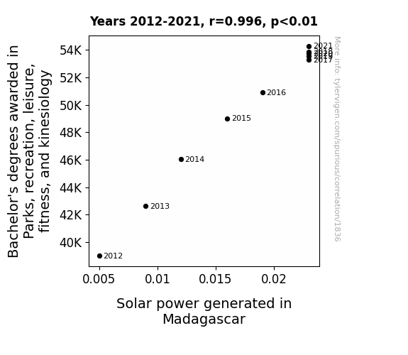 This means 99.1% of the change in the one variable (i.e., Solar power generated in Madagascar) is predictable based on the change in the other (i.e., Bachelor's degrees awarded in Parks & Recreation) over the 10 years from 2012 through 2021.