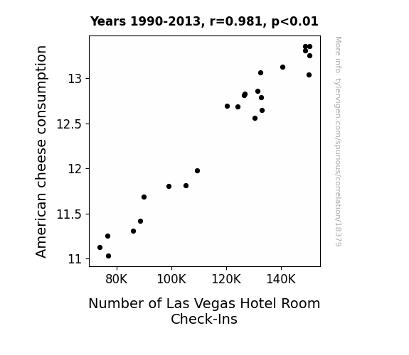 This means 96.3% of the change in the one variable (i.e., Number of Las Vegas Hotel Room Check-Ins) is predictable based on the change in the other (i.e., American cheese consumption) over the 24 years from 1990 through 2013.
