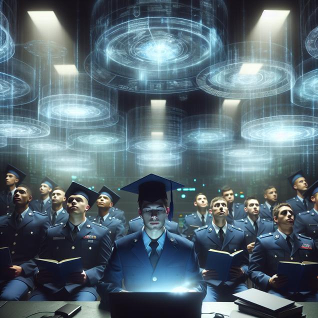 Prompt: In the dimly lit classroom at the prestigious military academy, a group of proud cadets gathers, each holding aloft their freshly awarded Master's degrees in Military Technologies, the coveted documents standing out against their crisp uniforms. Overhead, the soft glow of holographic displays illuminates their faces, casting an otherworldly hue as their expressions fill with pride and determination. Nearby, a lone figure sits at a computer terminal, silhouetted against the ambient light, lost in a search for answers while typing "I have a headache" into the search bar. The atmosphere crackles with a sense of achievement and the mystery of the digital world. The depiction should include only scenes, people, and objects, it should not include text or speech bubbles.