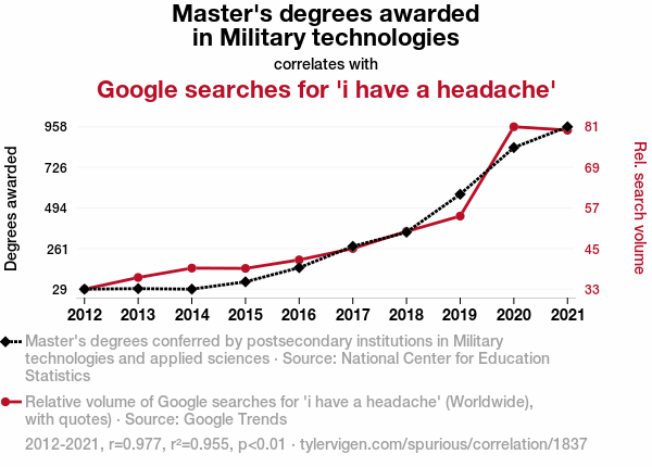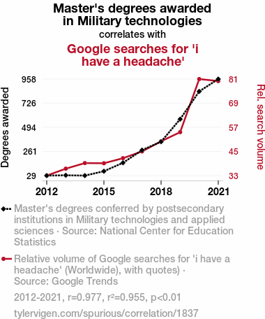 User prompt: Please provide potential search keywords for a paper titled Migrant Militants and Migraines: Matching Master's Degrees in Military Technologies with Migraine-related Google Searches with an abstract of This paper aims to explore the curious correlation between the number of Master's degrees awarded in Military technologies and the frequency of Google searches for 'i have a headache'. The research team utilized data from the National Center for Education Statistics to track the number of advanced degrees in military technology and Google Trends to monitor search trends. Surprisingly, our analysis revealed a striking correlation coefficient of 0.9770949 and p < 0.01 when considering the period from 2012 to 2021. This unexpected connection raises intriguing questions about potential stressors related to military education and their impact on public health, or perhaps the possibility that searching for military technologies induces headaches in unsuspecting Google users. In any case, this research contributes to the understanding of the whimsical and wacky ways in which seemingly unrelated phenomena might be connected.