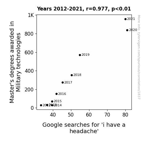 This means 95.5% of the change in the one variable (i.e., Google searches for 'i have a headache') is predictable based on the change in the other (i.e., Master's degrees awarded in Military technologies) over the 10 years from 2012 through 2021.