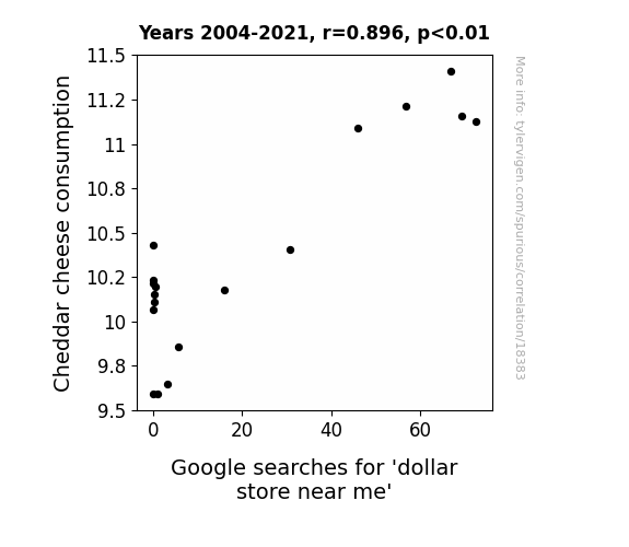 This means 80.2% of the change in the one variable (i.e., Google searches for 'dollar store near me') is predictable based on the change in the other (i.e., Cheddar cheese consumption) over the 18 years from 2004 through 2021.