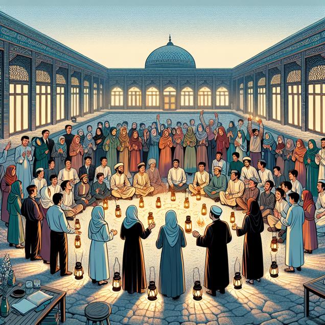 Prompt: Create an image of a serene courtyard in Kazakhstan, where a group of students is celebrating the achievement of their Bachelor's degrees in Philosophy and religious studies. The courtyard is illuminated by flickering kerosene lanterns, casting a warm glow as the sun sets. The students are gathered in a circle, with expressions of joy and accomplishment on their faces. The atmosphere is peaceful and contemplative, with a sense of quiet celebration. The depiction should include only scenes, people, and objects, it should not include text or speech bubbles.