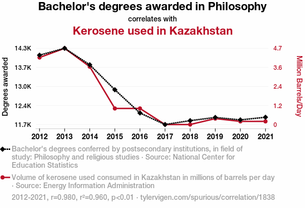 This means 96% of the change in the one variable (i.e., Kerosene used in Kazakhstan) is predictable based on the change in the other (i.e., Bachelor's degrees awarded in Philosophy) over the 10 years from 2012 through 2021.