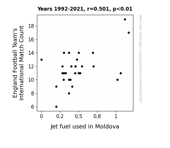 This means 25.1% of the change in the one variable (i.e., Jet fuel used in Moldova) is predictable based on the change in the other (i.e., England Football Team's International Match Count) over the 30 years from 1992 through 2021.