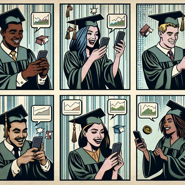Prompt: Create a comic-book-style illustration with muted colors and a dotted halftone pattern from the 1960s depicting a group of happy students in graduation gowns holding their Associates degrees in Social Sciences and History. The students are portrayed checking their smartphones to see the rising stock price of Ross Stores, smiling with excitement as they see the positive trend. The illustration should capture the essence of the 1960s comic style while conveying the joy and optimism of the students as they embark on their new journey. The depiction should include only scenes, people, and objects, it should not include text or speech bubbles.