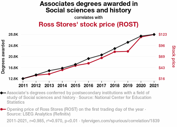Associates degrees, Social Sciences, History, Ross Stores, stock price, correlation, educational achievements, retail industry, National Center for Education Statistics, LSEG Analytics, Refinitiv, market forces, academic pursuits, stock market movements